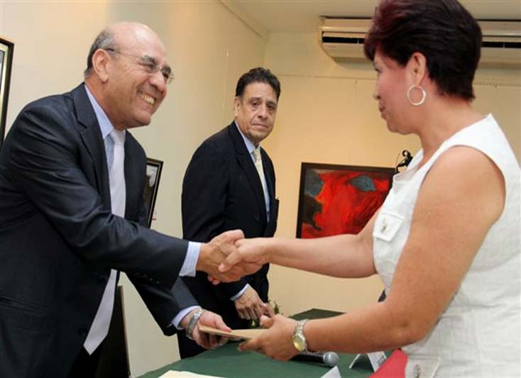 El acto contó con la presencia del Ministro de Educación, Ing. Carlos Canjura Linares, quien acompañó al Embajador Raúl López Lira a la entrega de 7 cheques y de una colección de libros de texto a los directores de los centros escolares de El Salvador que forman parte del programa.