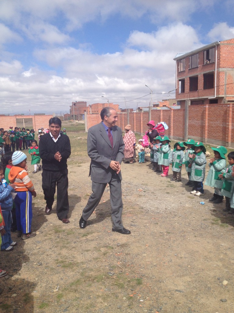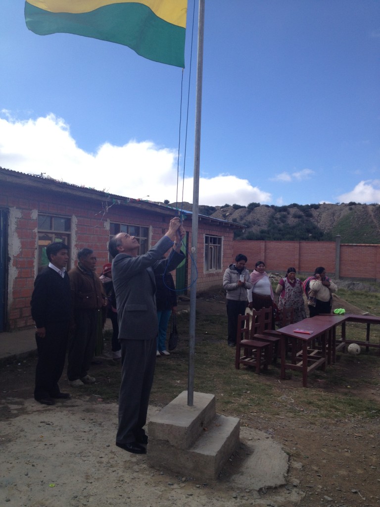 Las autoridades educativas de la Escuela, así como la junta de padres de familia, organizaron una pequeña ceremonia para dar la bienvenida al personal de la Embajada presente en el acto. Correspondió al Embajador Valezzi el honor de izar la bandera boliviana, mientras los alumnos del plantel entonaban el Himno Nacional. Asimismo, cada grupo realizó un número cultural sencillo entre canciones, poemas y otros.