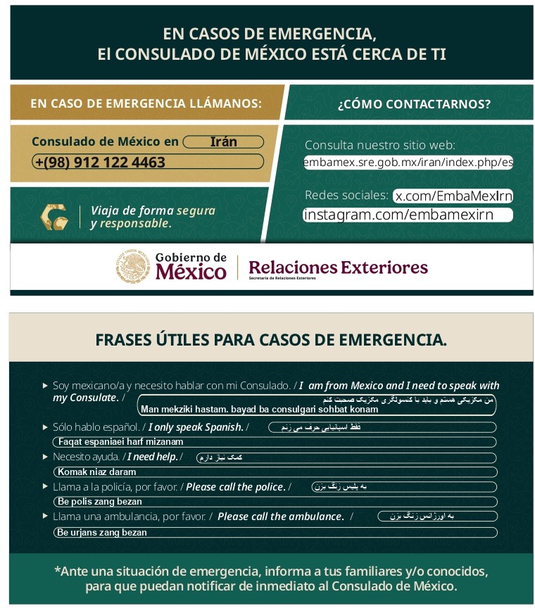 - Notifica a la Embajada de México en Irán tu fecha de llegada, itinerario y duración de estancia, para facilitar la comunicación y apoyo en caso de emergencia.