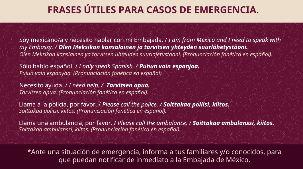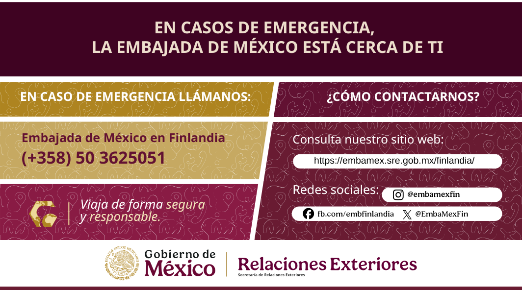 Recuerda: En caso de detención tienes derecho a la notificación consular. Personal consular te visitará en cuanto se lo permitan las autoridades locales. Número de emergencia para personas mexicanas en Finlandia +358 503625051.