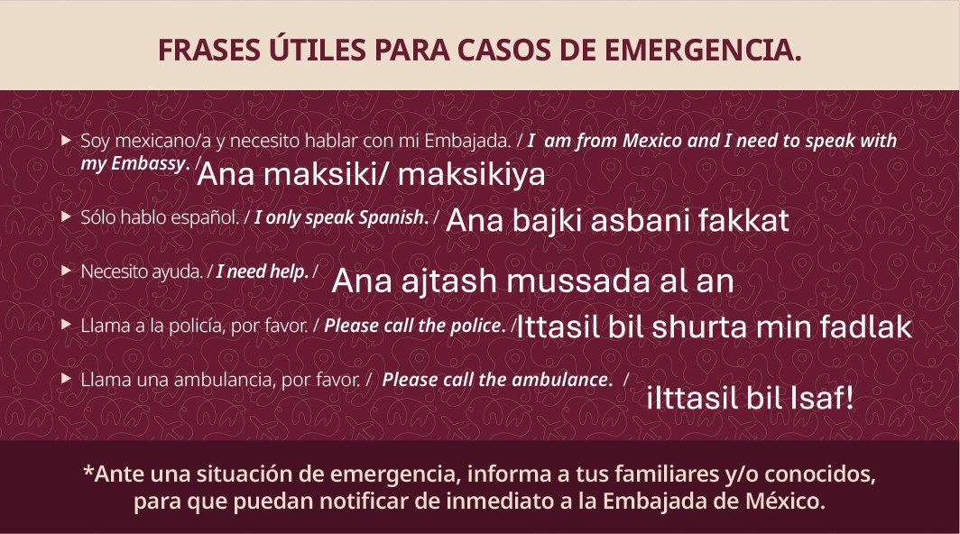 Se invita a las personas viajeras mexicanas a registrarse en el Sistema de Registro para Personas Mexicanas en el Exterior (SIRME), y consultar la página electrónica de la Embajada de México en Egipto para mantenerse al tanto de las actualizaciones más relevantes sobre esta información.