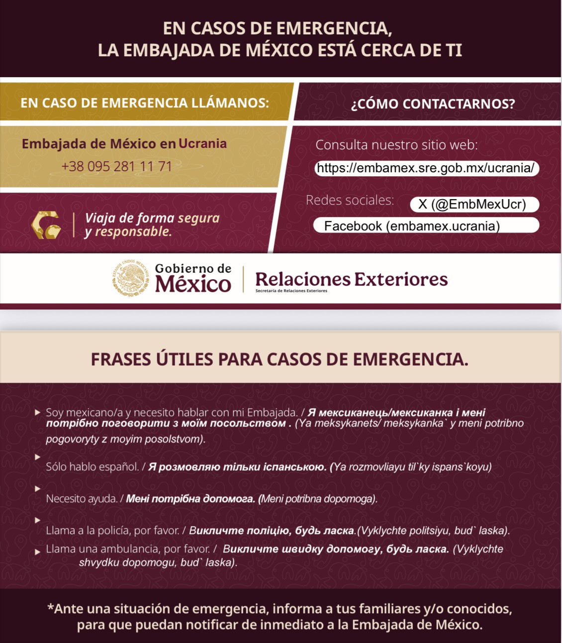 En caso de emergencia, sigue las indicaciones de las autoridades locales. En caso de requerir asistencia especial, contacta a la embajada de México más cercana.