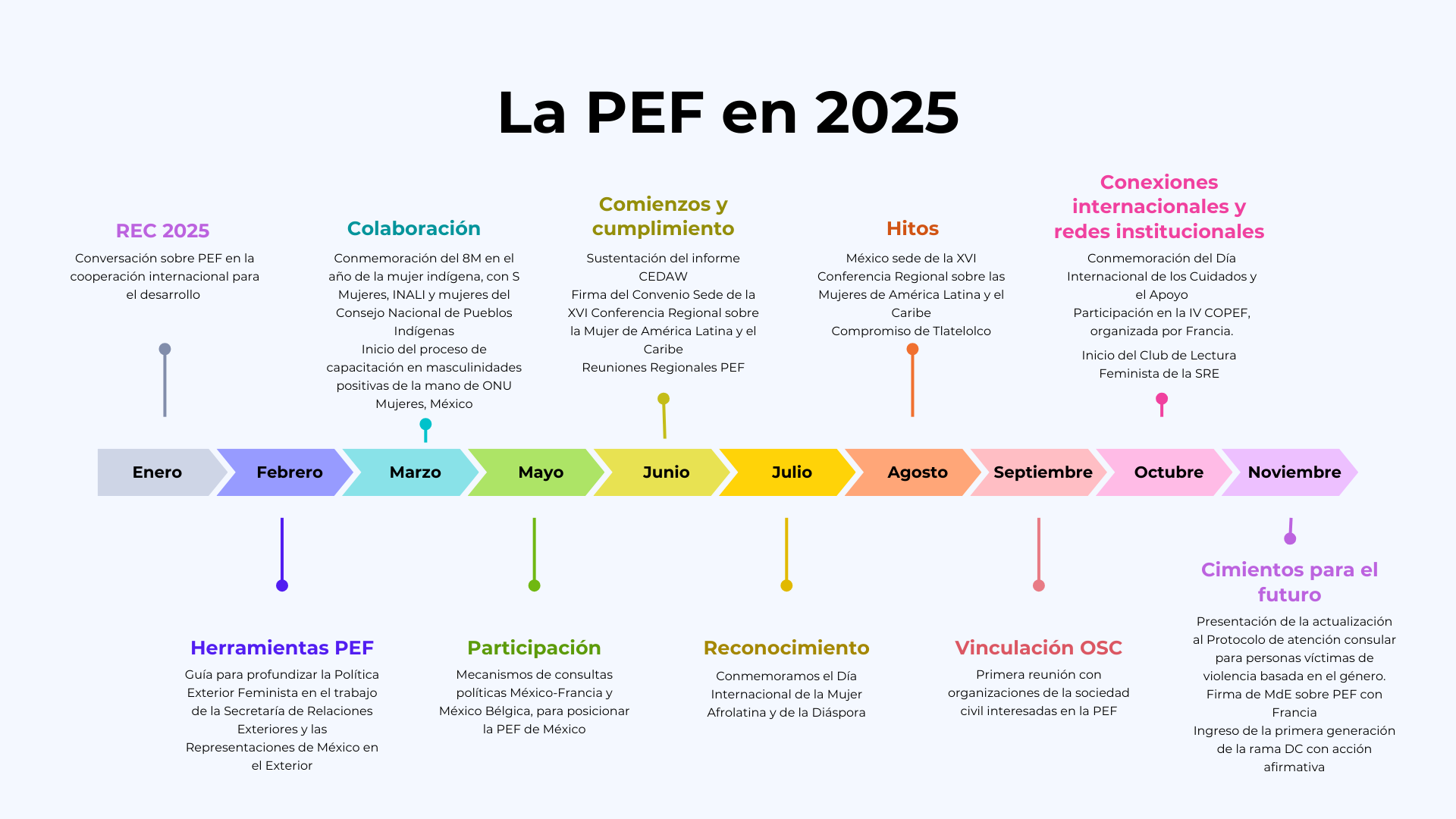 Este espacio reúne los documentos clave que guían la conceptualización e implementación de la Política Exterior Feminista (PEF) de México. Define sus principios, objetivos y marcos de actuación; traduce sus compromisos en acciones concretas, dentro y fuera del país; y da cuenta del progreso y aprendizajes acumulados desde su adopción en 2020.