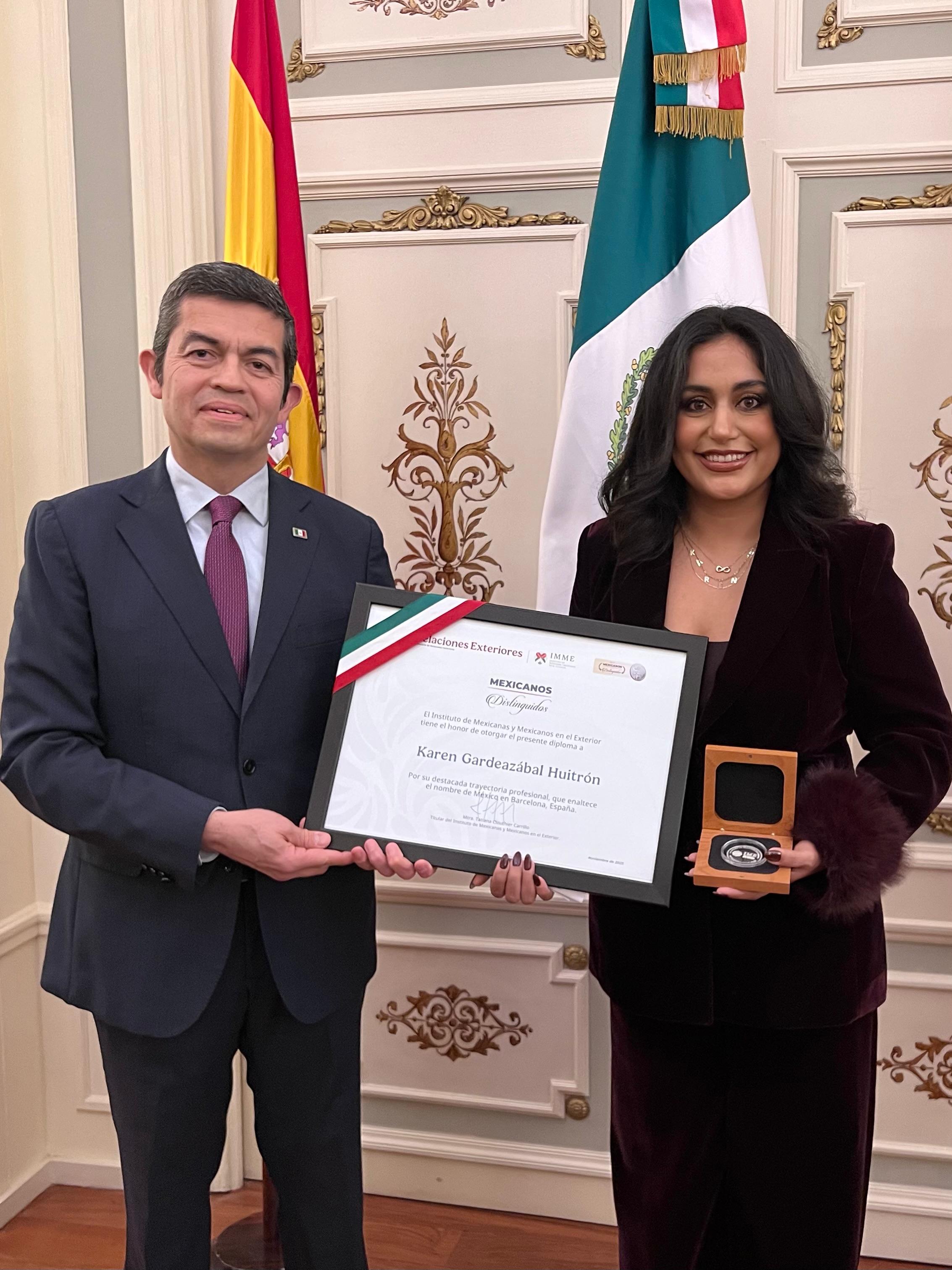 El Consulado de México en Barcelona llevó a cabo la ceremonia de entrega del Reconocimiento “Mexicanos Distinguidos 2025” a la soprano Karen Gardeazábal Huitrón, en reconocimiento a su destacada trayectoria artística internacional, su excelencia profesional y su contribución a la proyección del talento y la cultura mexicana en el exterior.